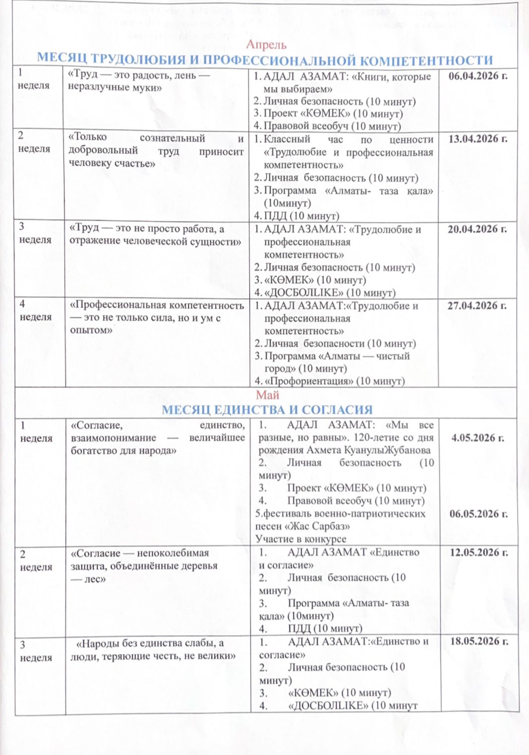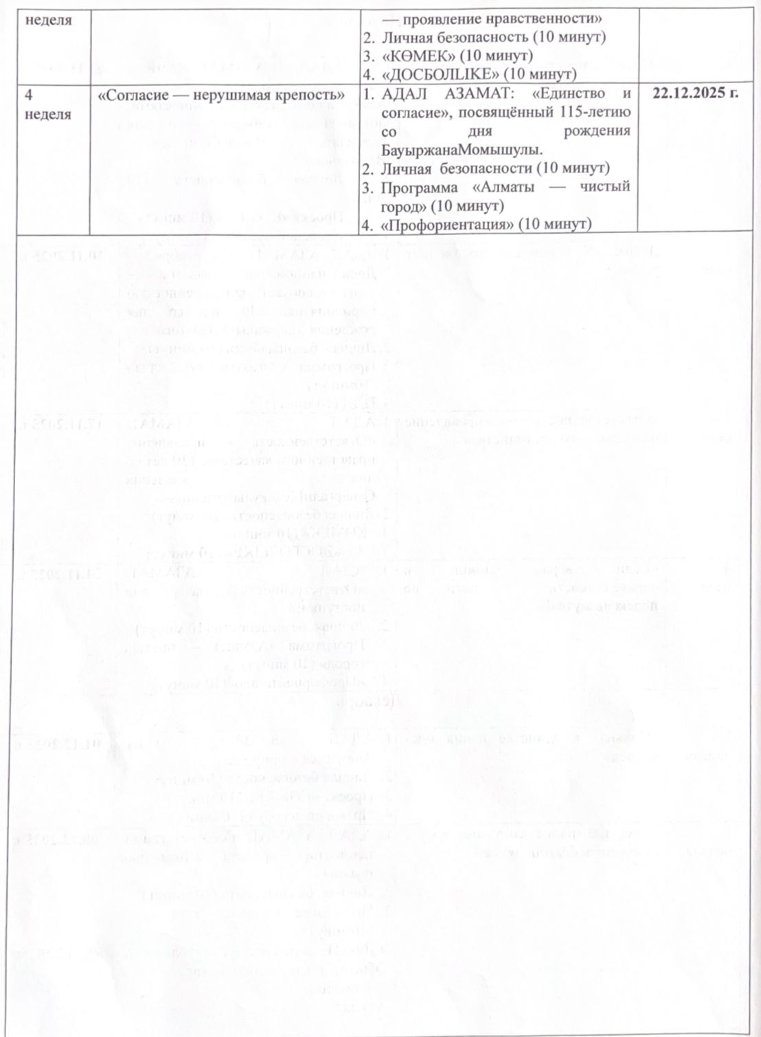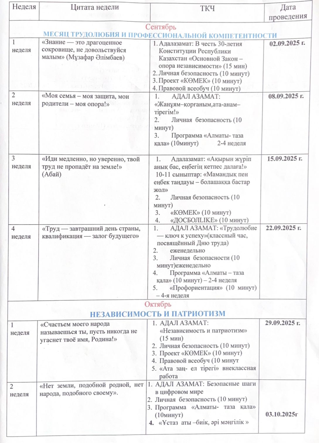 Тәрбие жұмысының циклограммасы 2025-2026 оқу жылы