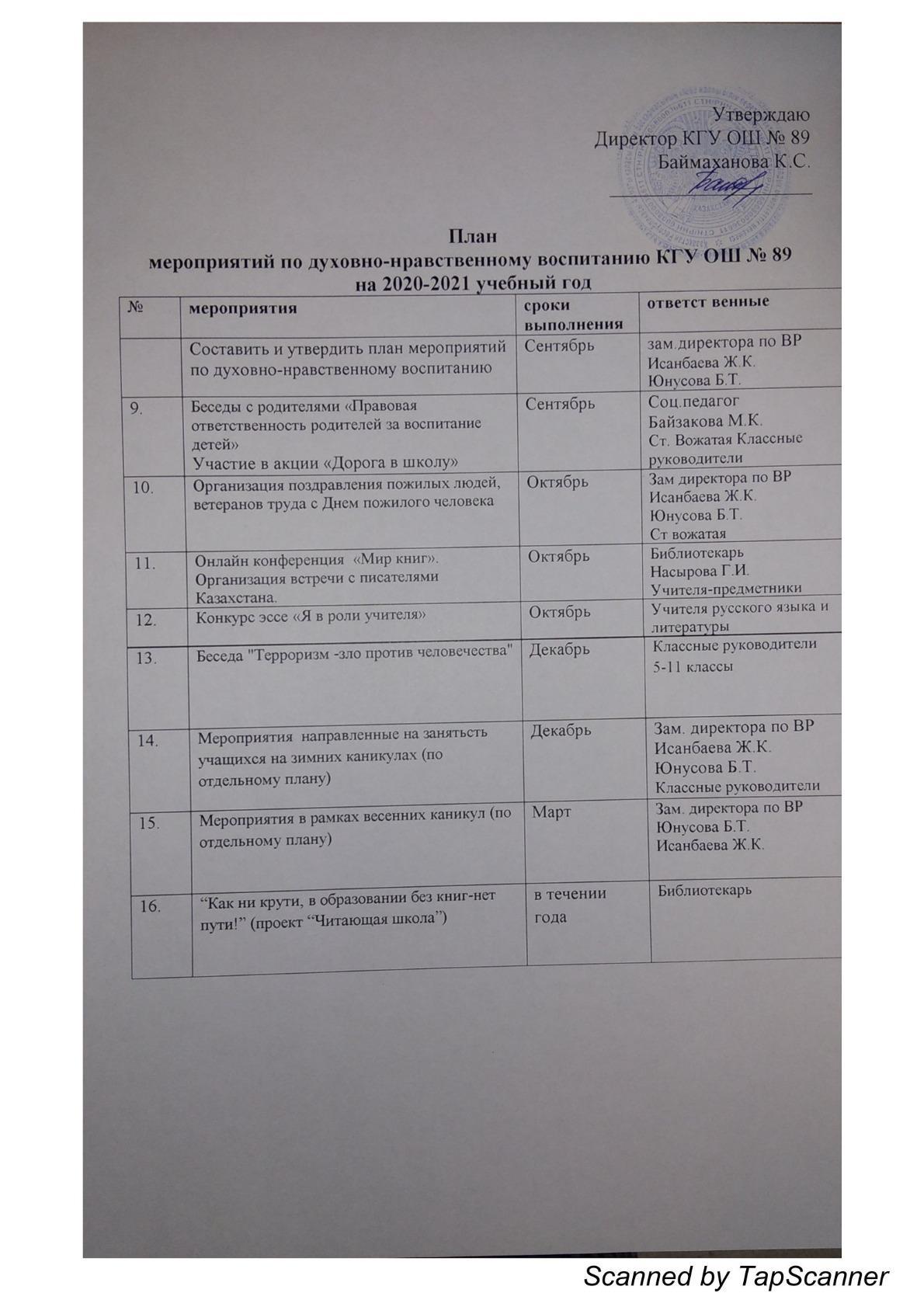 01 қыркүйек 2020 0 1 2 3 4 5 Рухани-адамгершілік тәрбие бойынша 2020-2021 оқу жылына арналған жылдық жоспар