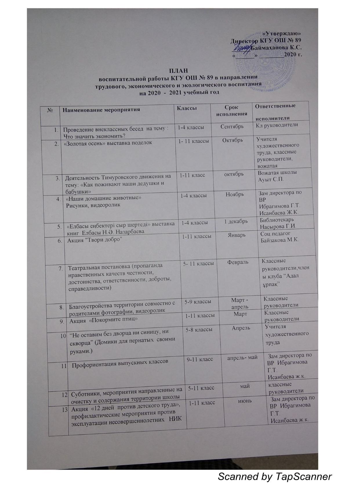 01 қыркүйек 2020 0 1 2 3 4 5 2020-2021 оқу жылына арналған Еңбек, экономикалық және экологиялық тәрбие бағыты бойынша жылдық жоспар