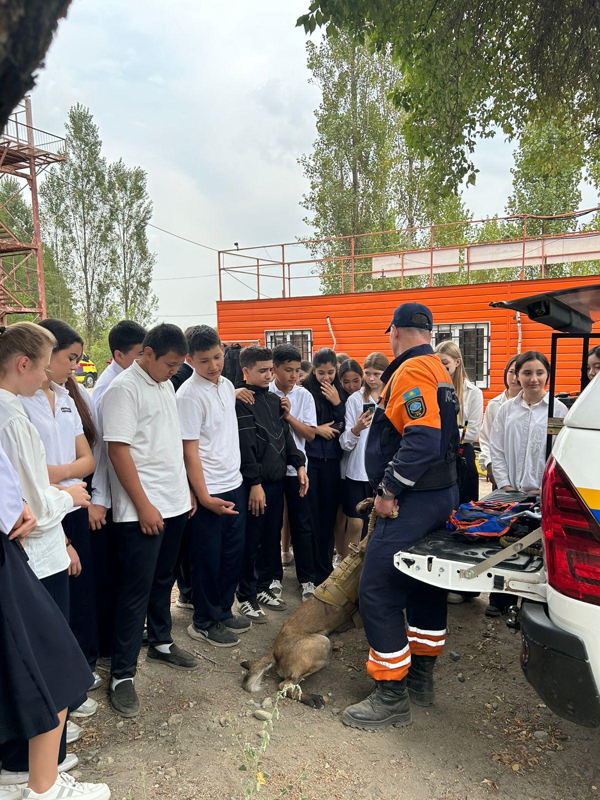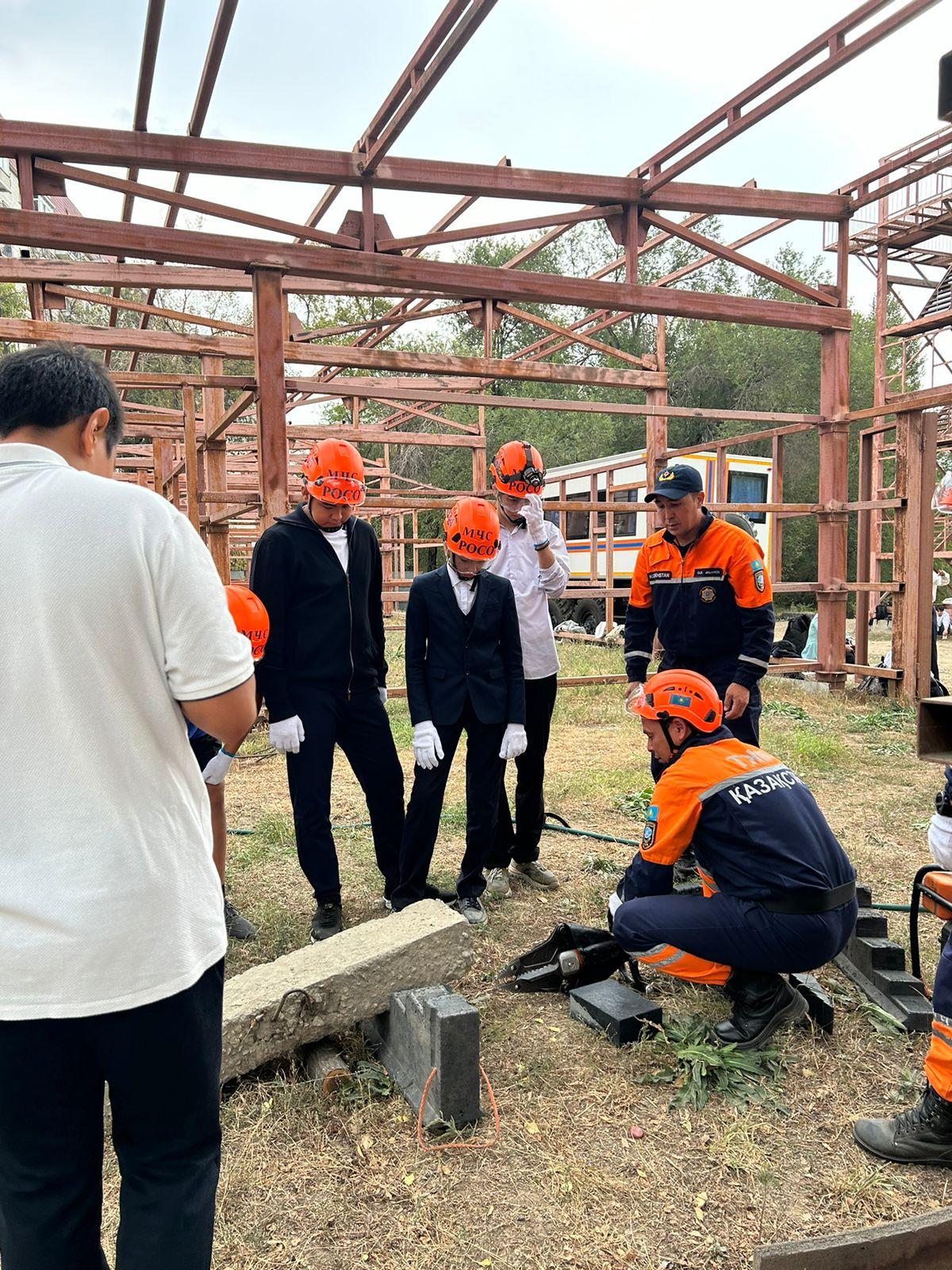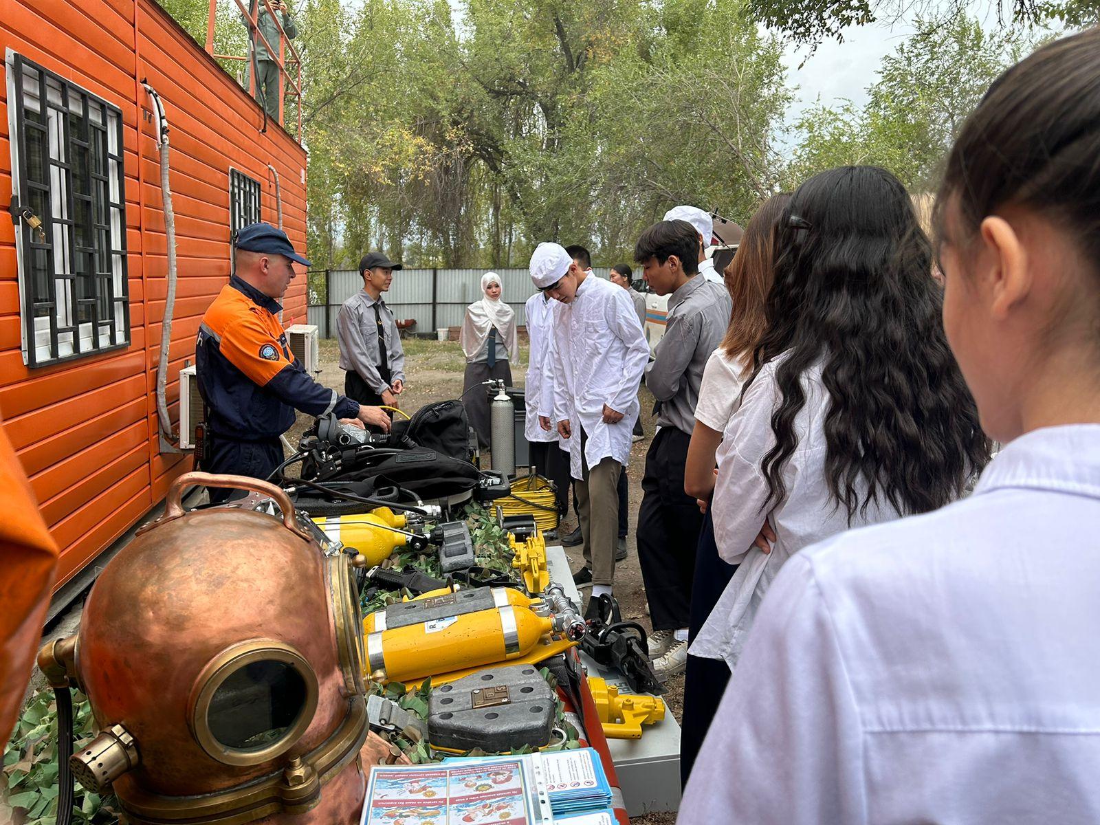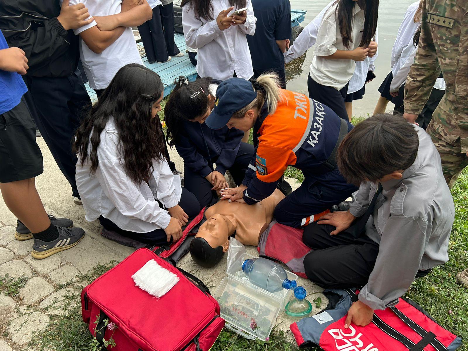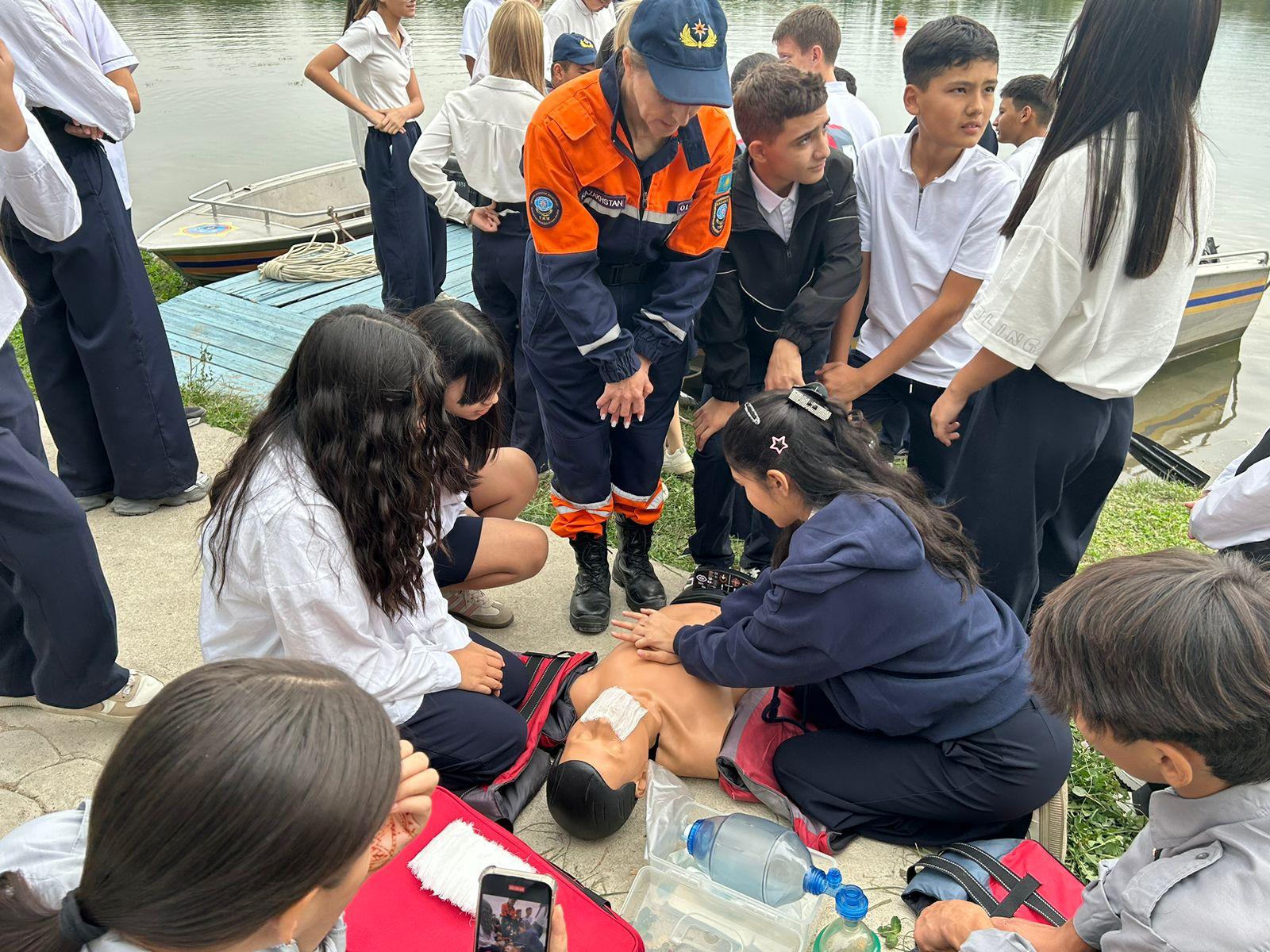 Сотрудники спасательной службы показали школьникам 7–8 классов КГУ ОШ №89 правила безопасного поведения на воде, работу с верёвками, лодками и носилками, а также приёмы оказания помощи утопающему.