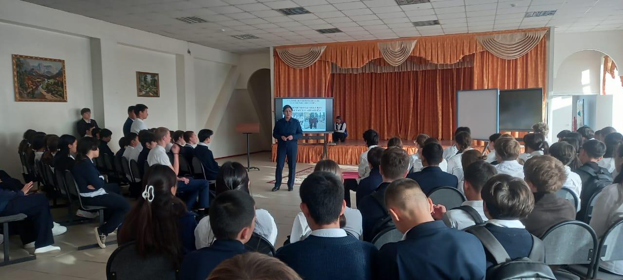 Түрксіб ауданы ПБ ООБ ОЮП УИП аға инспекторы, полиция майоры Мусаева Гузеля Исрапуловна 8–9 сынып оқушыларымен «Кәмелетке толмағандардың қылмыстық және әкімшілік жауапкершілігі», сондай-ақ «Есірткі және психотроптық заттардың зияны» тақырыптарында профилактикалық әңгіме өткізді. Іс-шара барысында бейнероликтер көрсетілді.