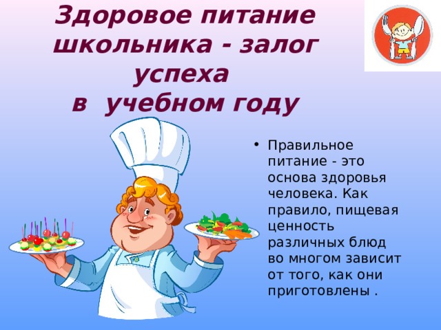 Основные принципы здорового питания для школьников:Разнообразие продуктов. В меню должны быть каши, мясо, рыба, овощи, фрукты, молочные продукты.