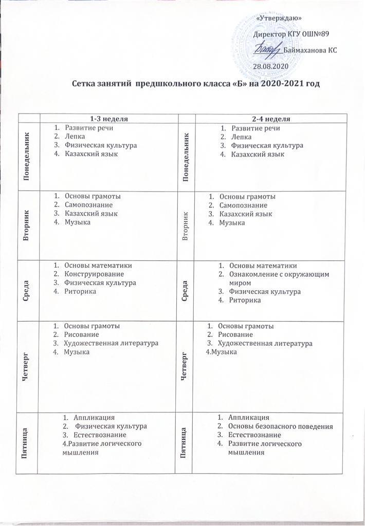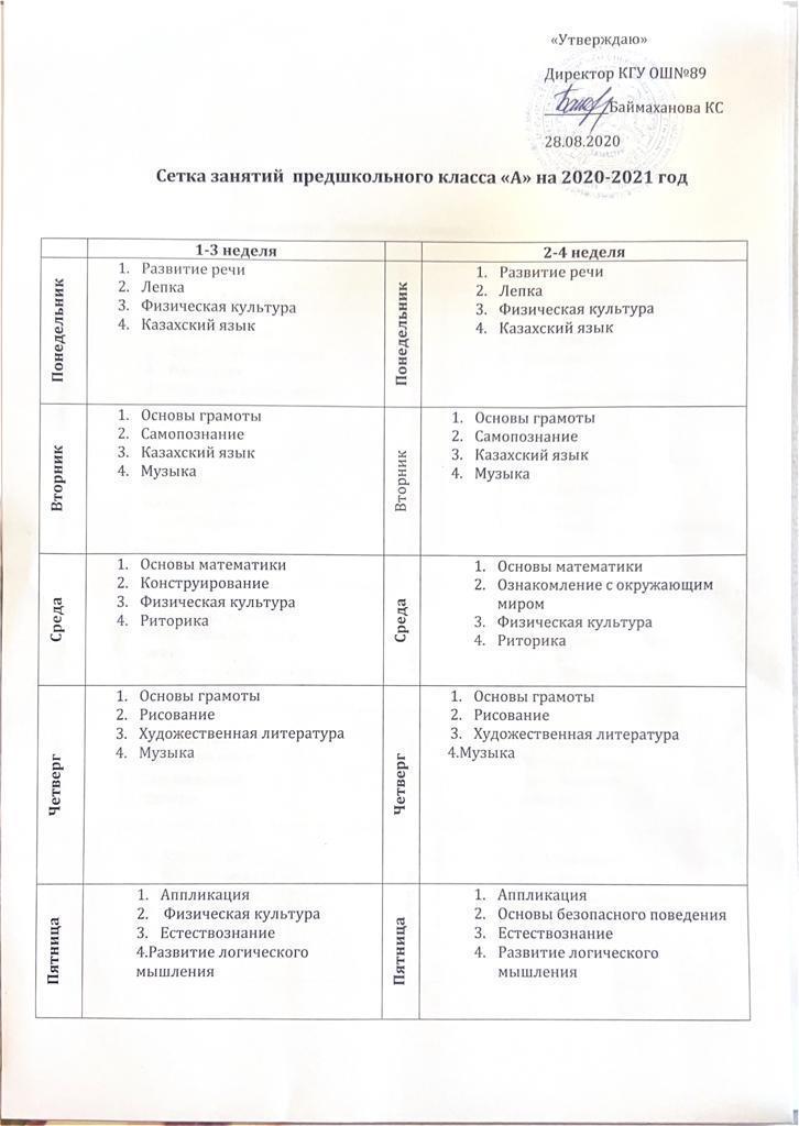 » мектепке дейін даярлық сыныптар сабақ кестесі 2020-2021