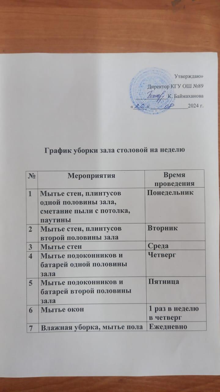 » №89 ЖББМ асханасының дәліздің тазалау кестесі