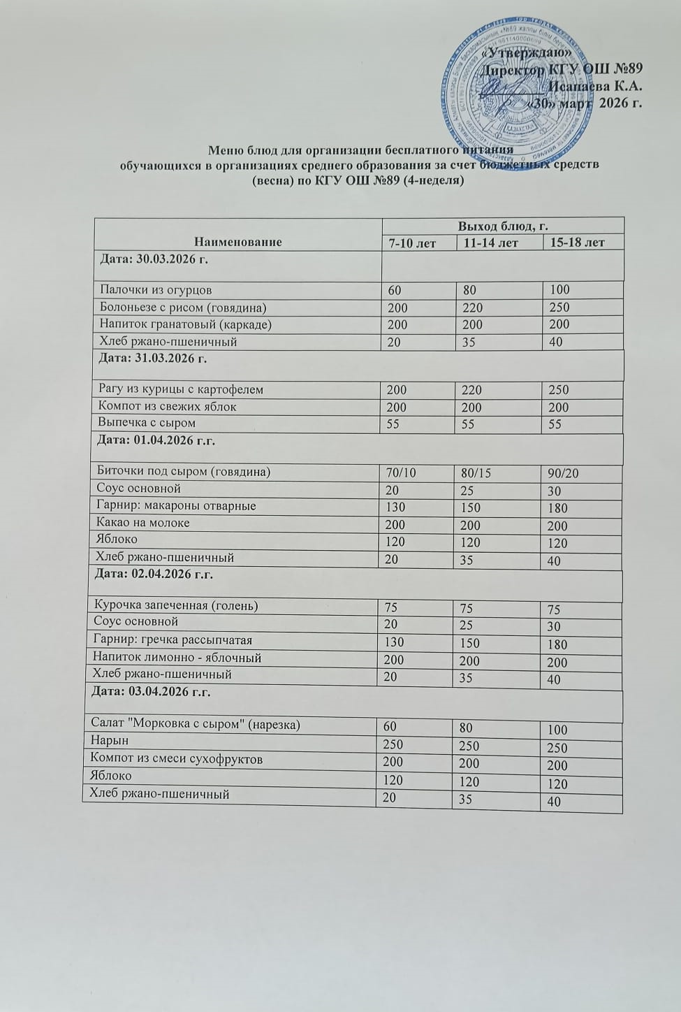 30/03/2026 Тегін тамақтануды ұйымдастыруға арналған ас мәзірі