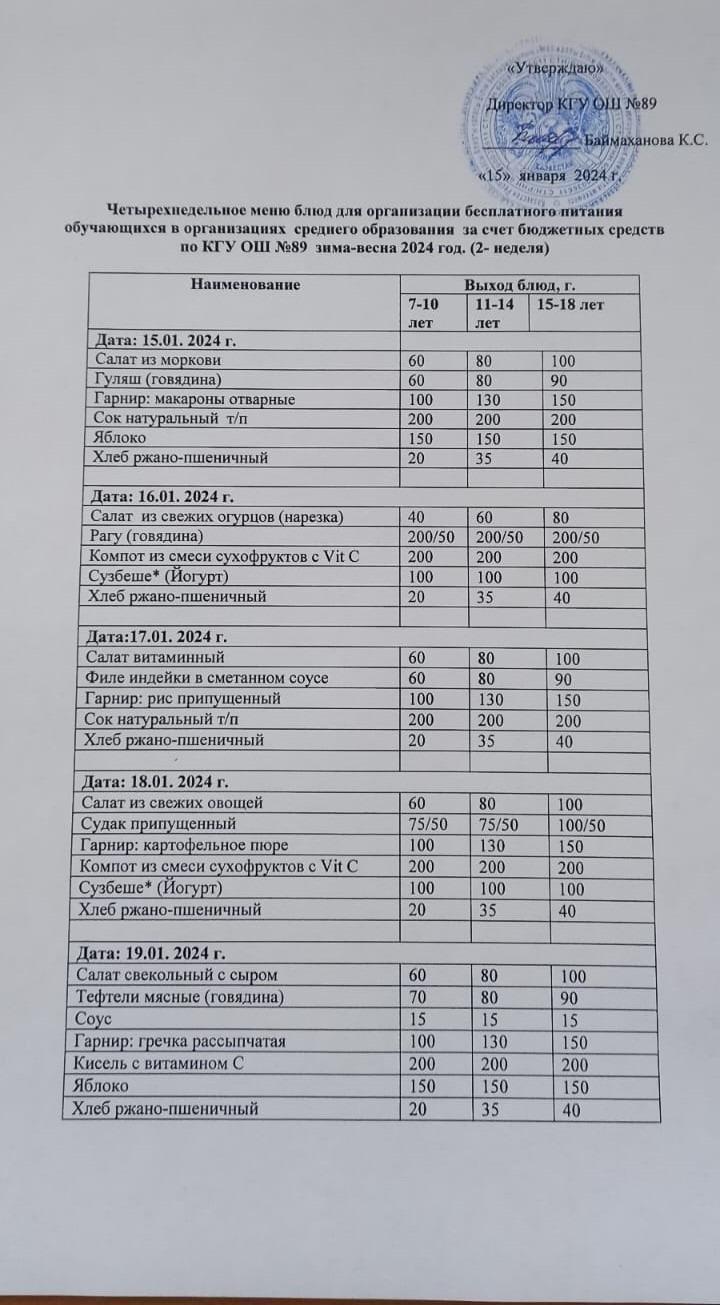 » Тегін тамақтануды ұйымдастыруға арналған ас мәзірі