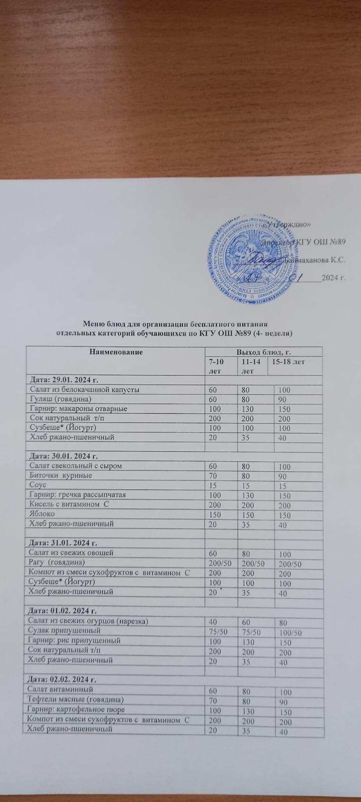 » Тегін тамақтануды ұйымдастыруға арналған ас мәзірі