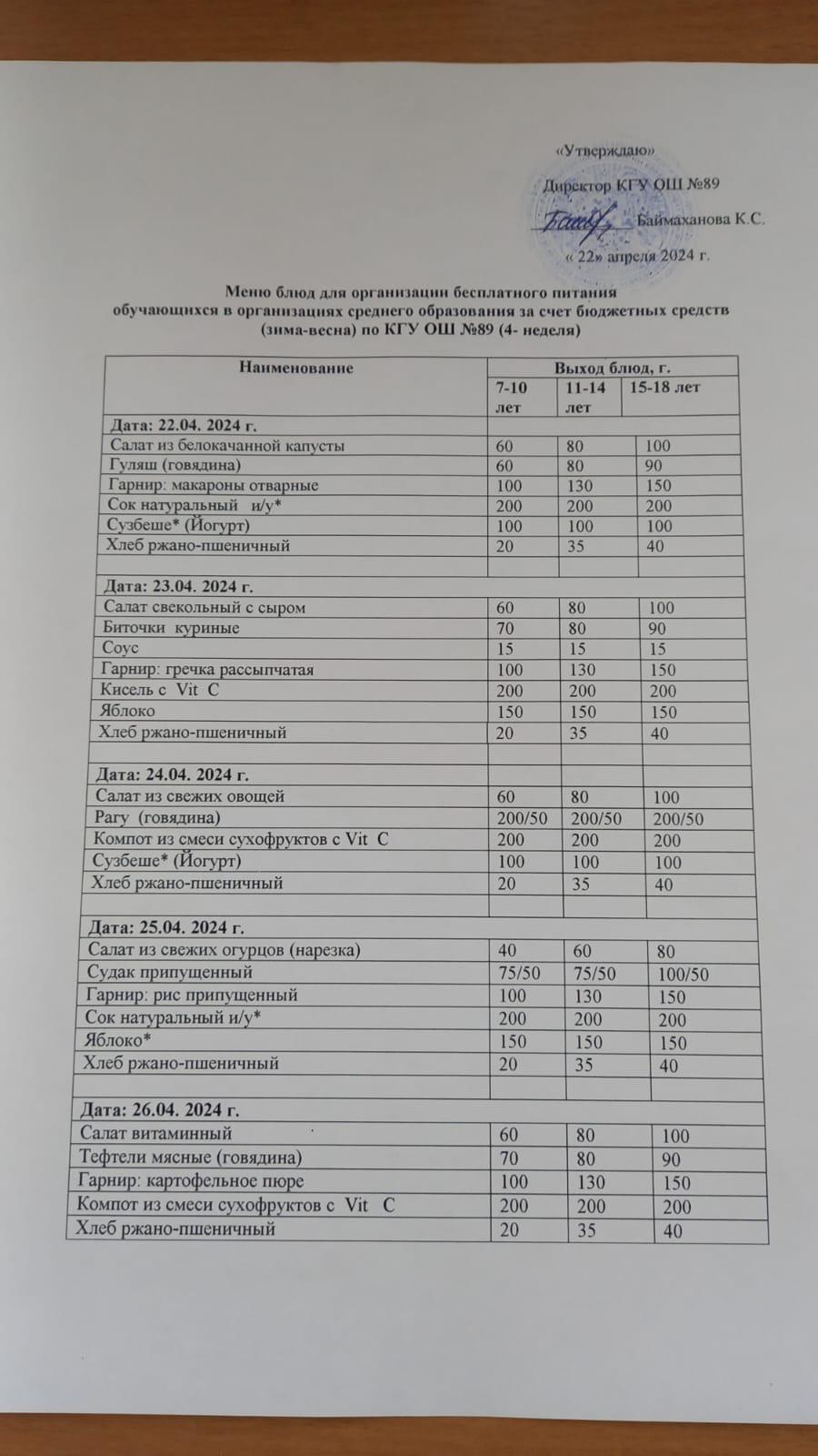 » Тегін тамақтануды ұйымдастыруға арналған ас мәзірі