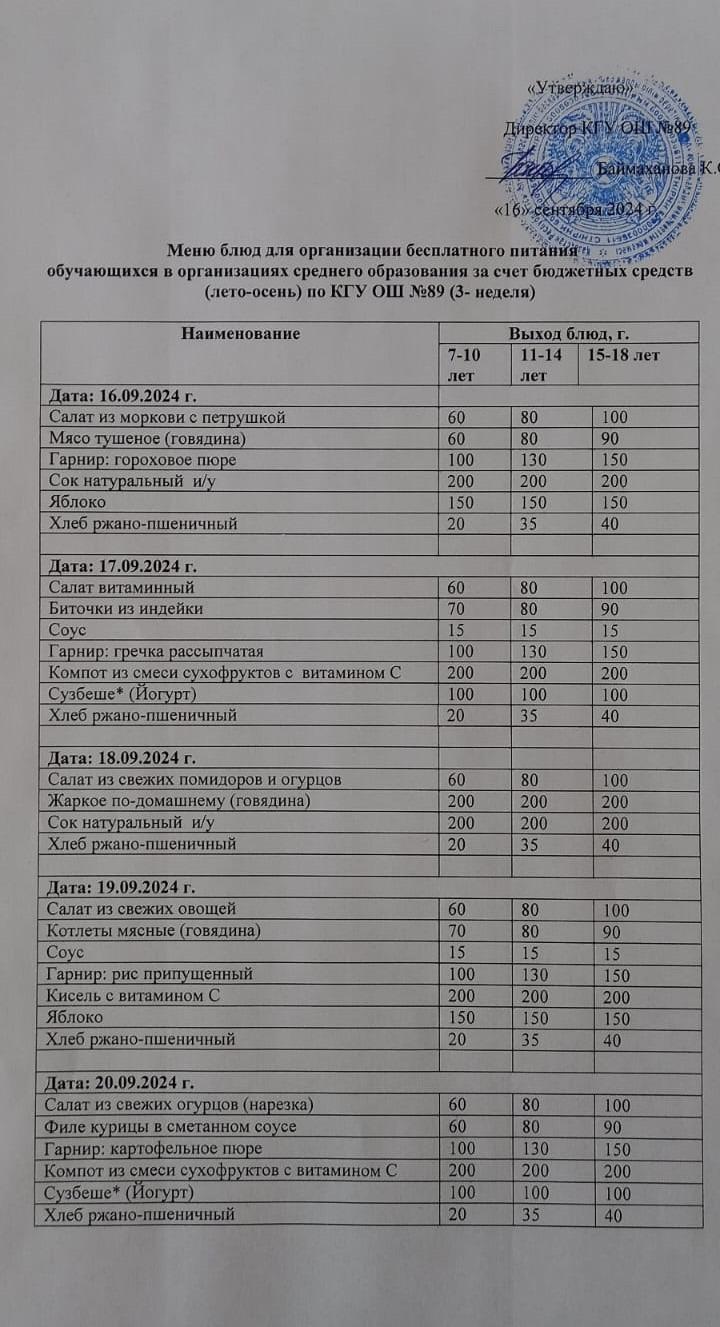 » Тегін тамақтануды ұйымдастыруға арналған ас мәзірі