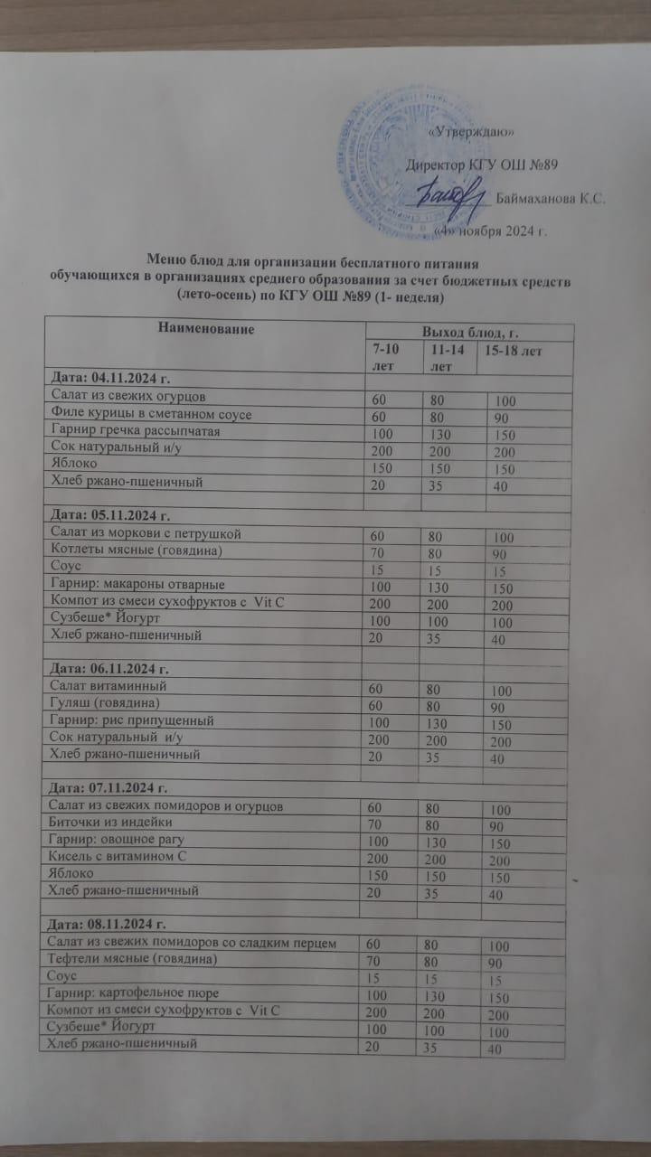 » Тегін тамақтануды ұйымдастыруға арналған ас мәзірі