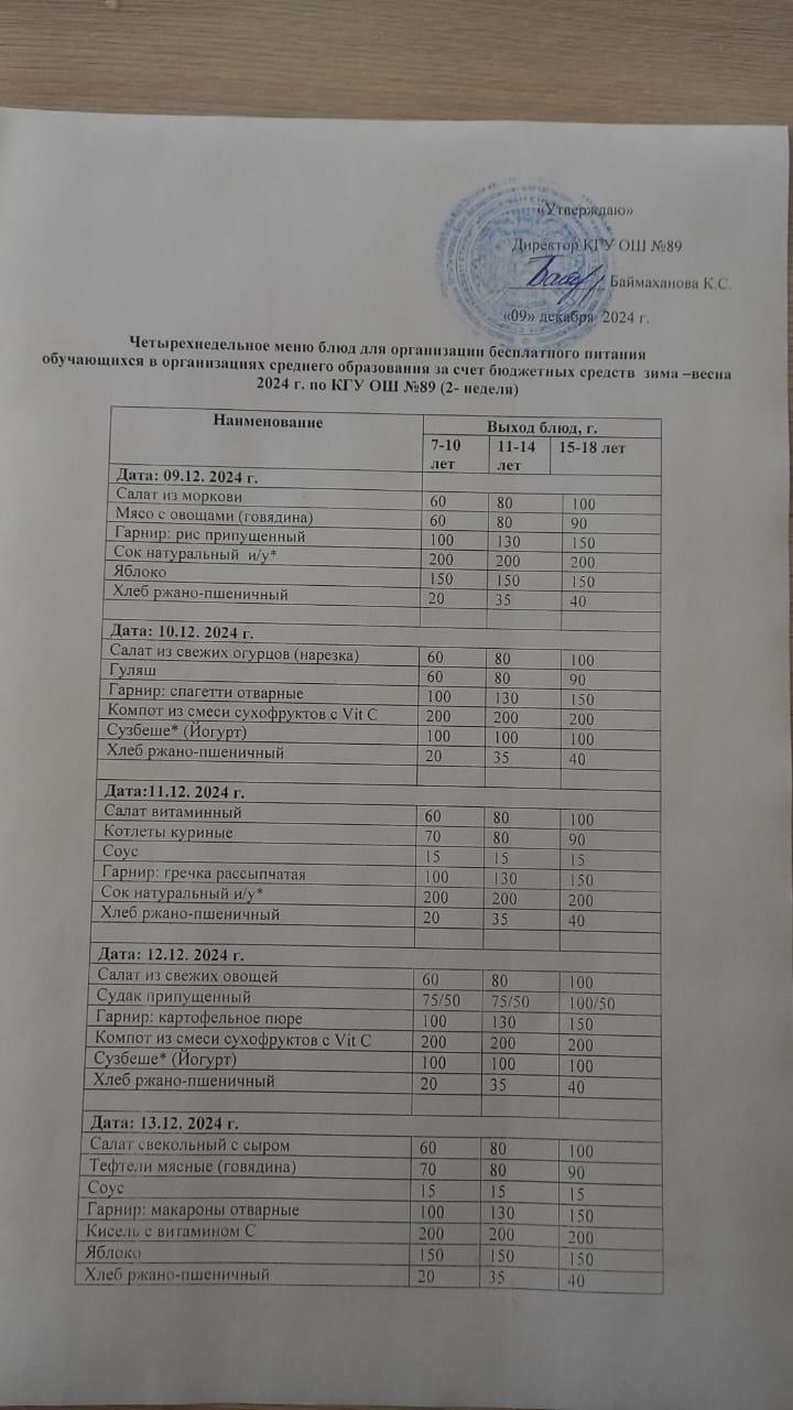 » Тегін тамақтануды ұйымдастыруға арналған ас мәзірі