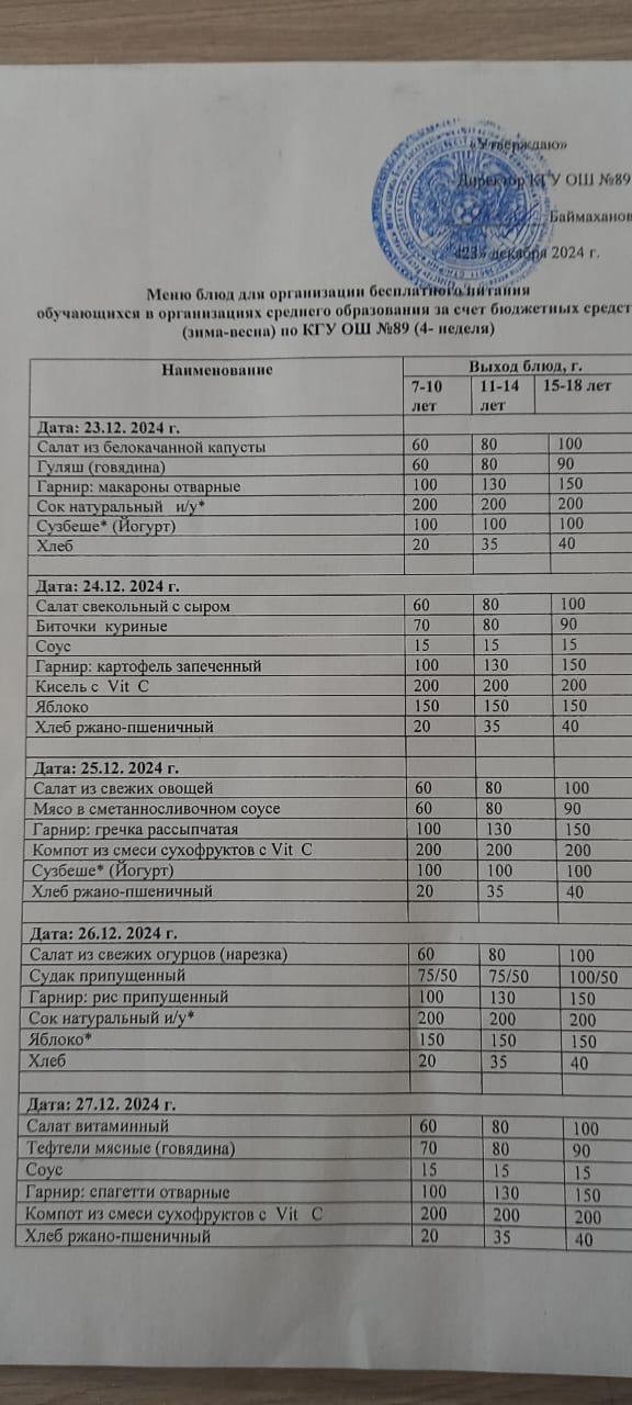 » Тегін тамақтануды ұйымдастыруға арналған ас мәзірі