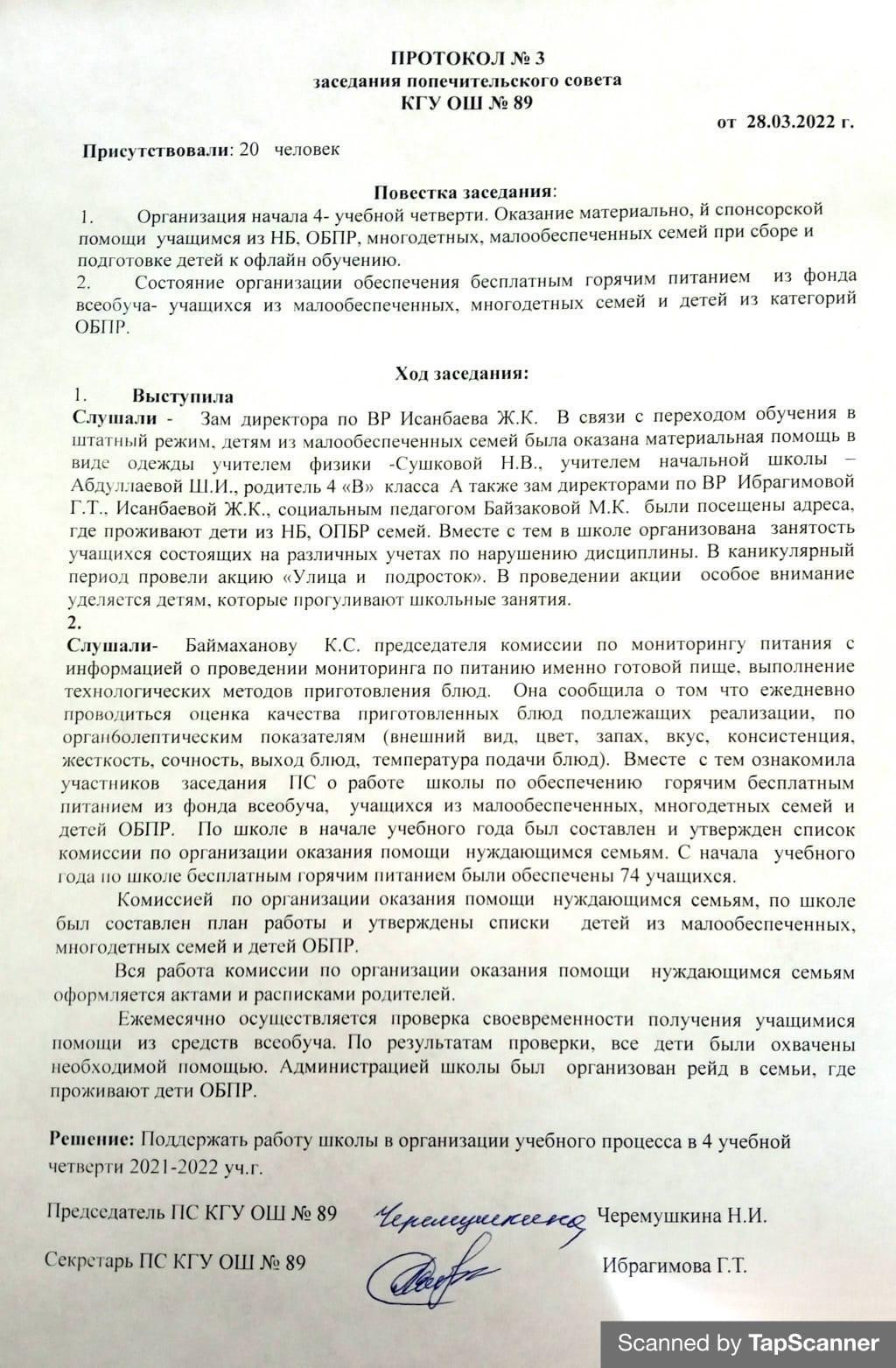 Протокол № 2 Попечительского Совета КГУ ОШ № 89