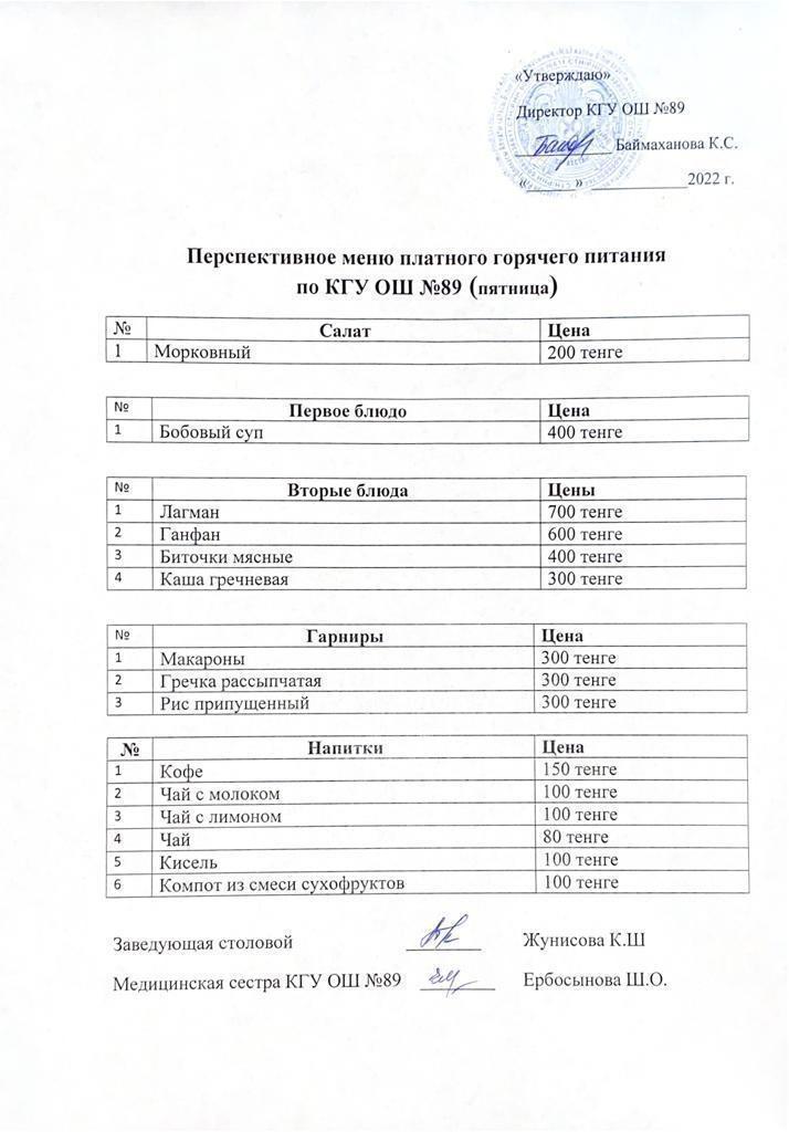 Ақылы буфеттік тамақтану мәзірі / Меню платного буфетного питания