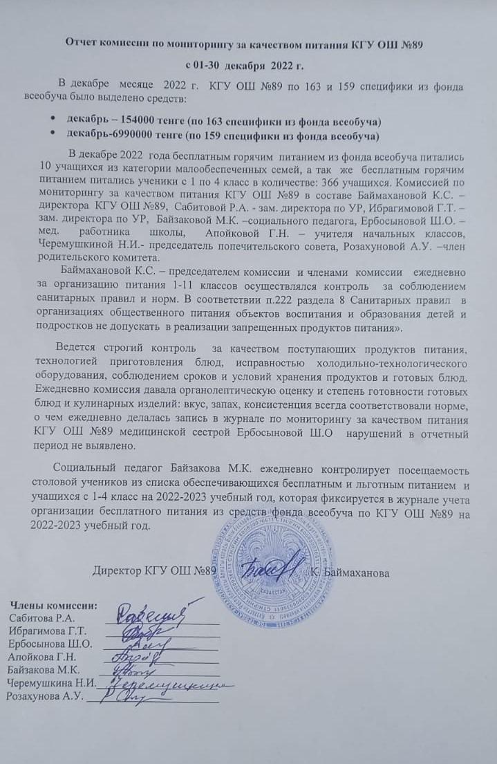 Тамақтану сапасын бақылау жөніндегі комиссияның желтоқсан айындағы есебі / Отчет комиссии по контролю за качеством питания за декабрь месяц