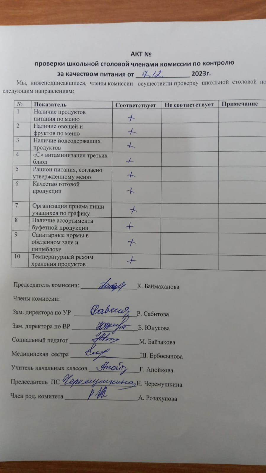 07 желтоқсан 2023 0 1 2 3 4 5 "Тамақтану сапасын бақылау жөніндегі комиссия мүшелерінің мектеп асханасын тексеру актісі / Акт проверки школьной столовой членами комиссии по контролю за качеством питания"