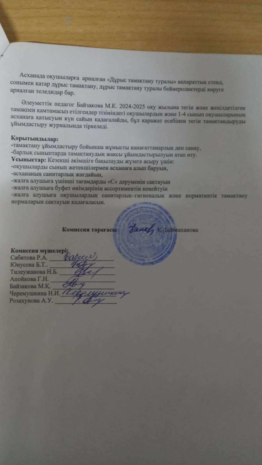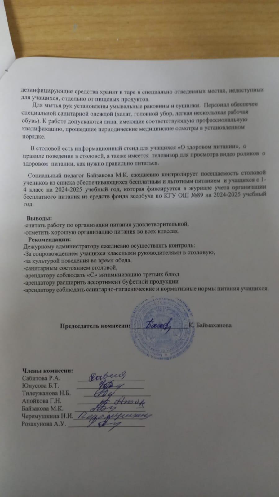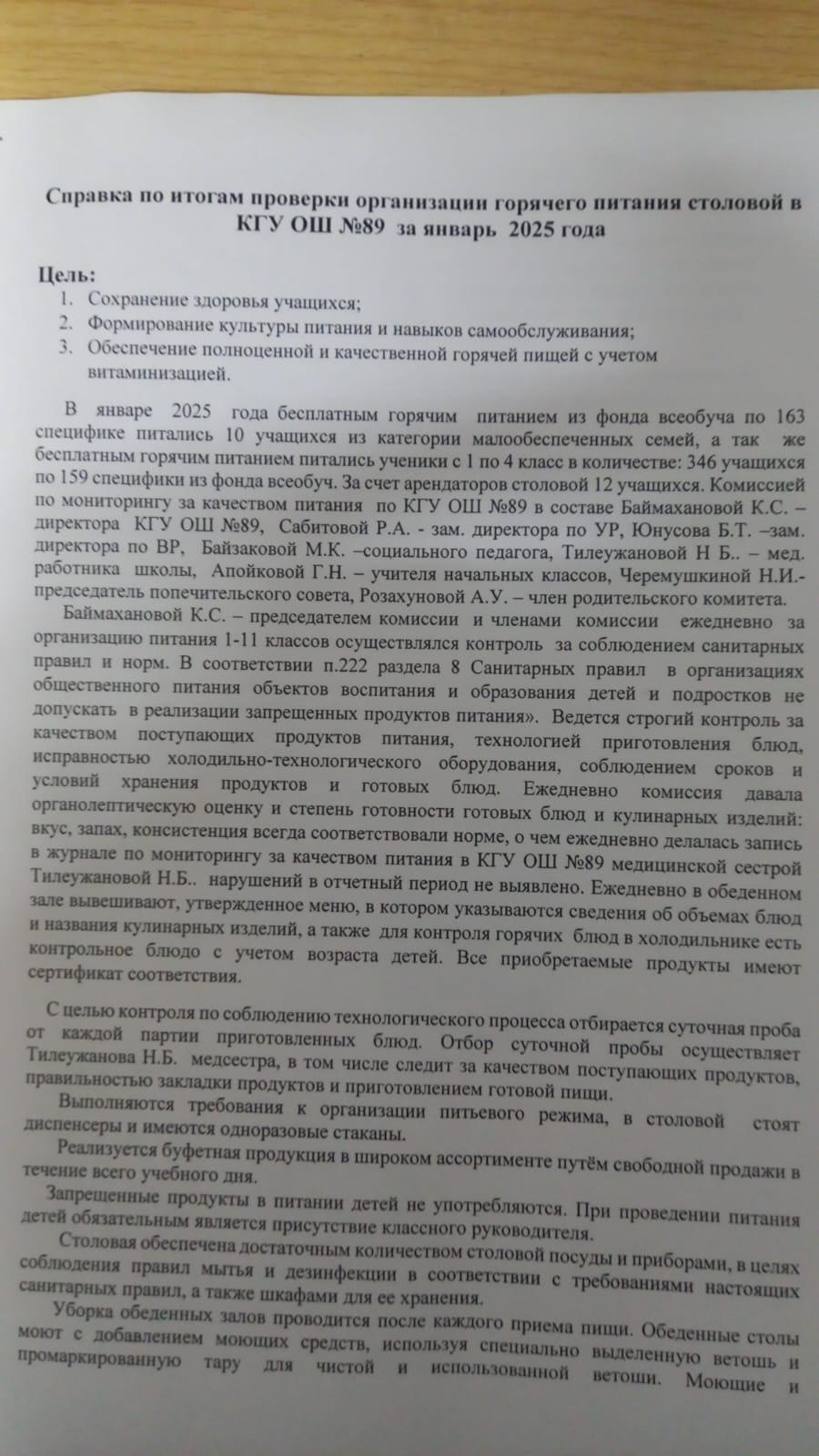 31 қаңтар 2025 0 1 2 3 4 5 2025 жылғы қаңтар айындаты Nº89 ЖББМ КММ-де асхананың ыстық тамақтануын ұйымдастыруды тексеру қорытындысы бойынша анықтама