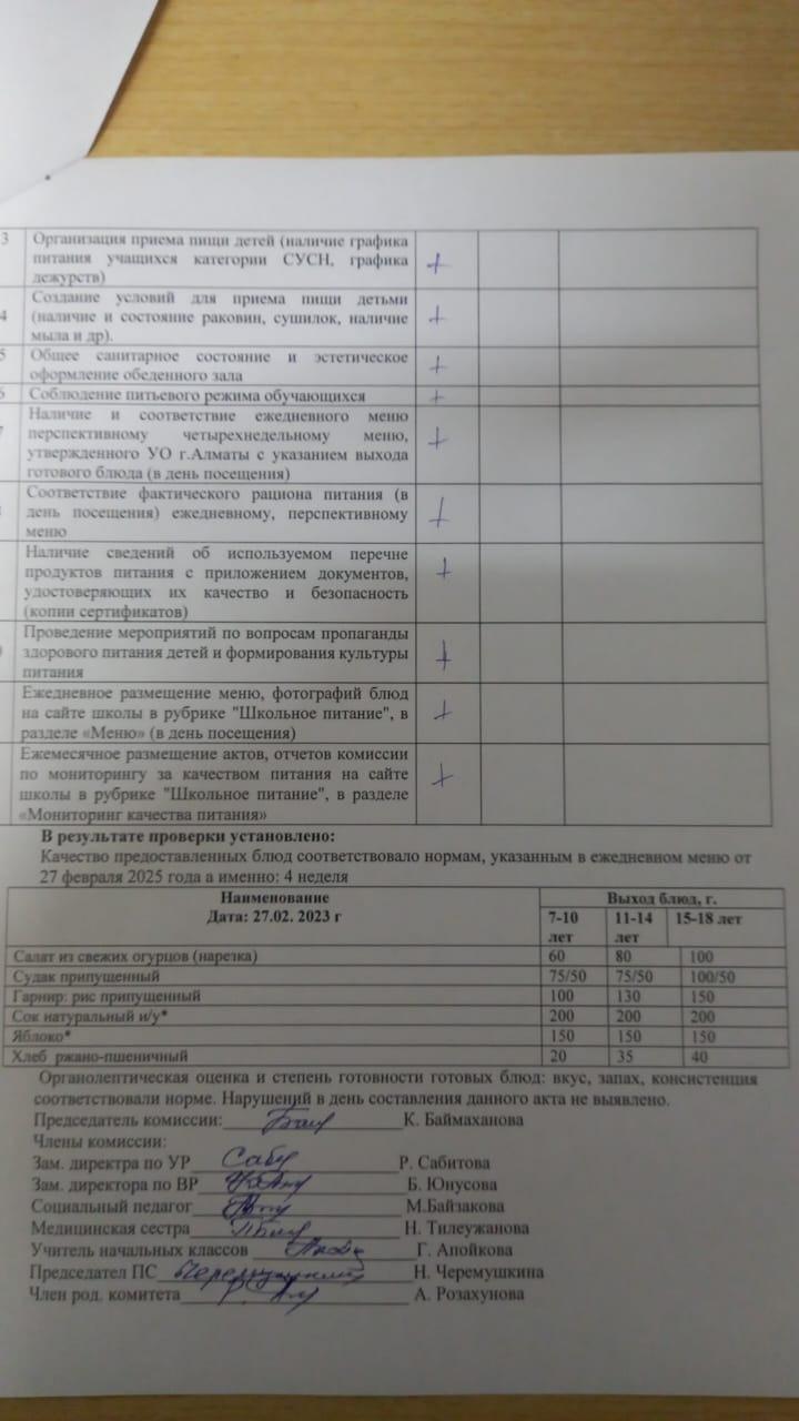 Ақпан айындағы тамақтану сапасын бақылау жөніндегі комиссияның есебі / Отчет комиссии по мониторингу за качеством питания за февраль месяц