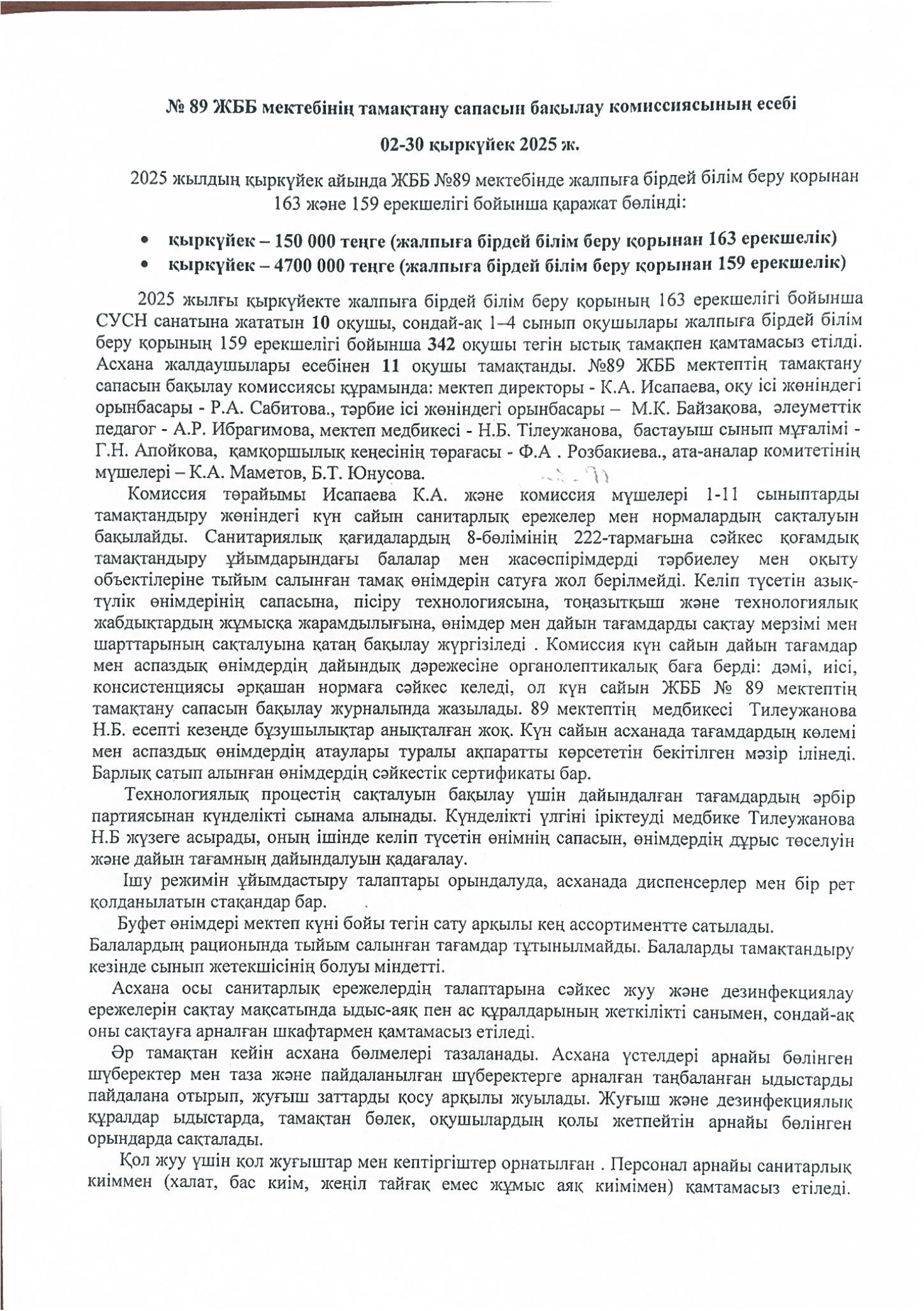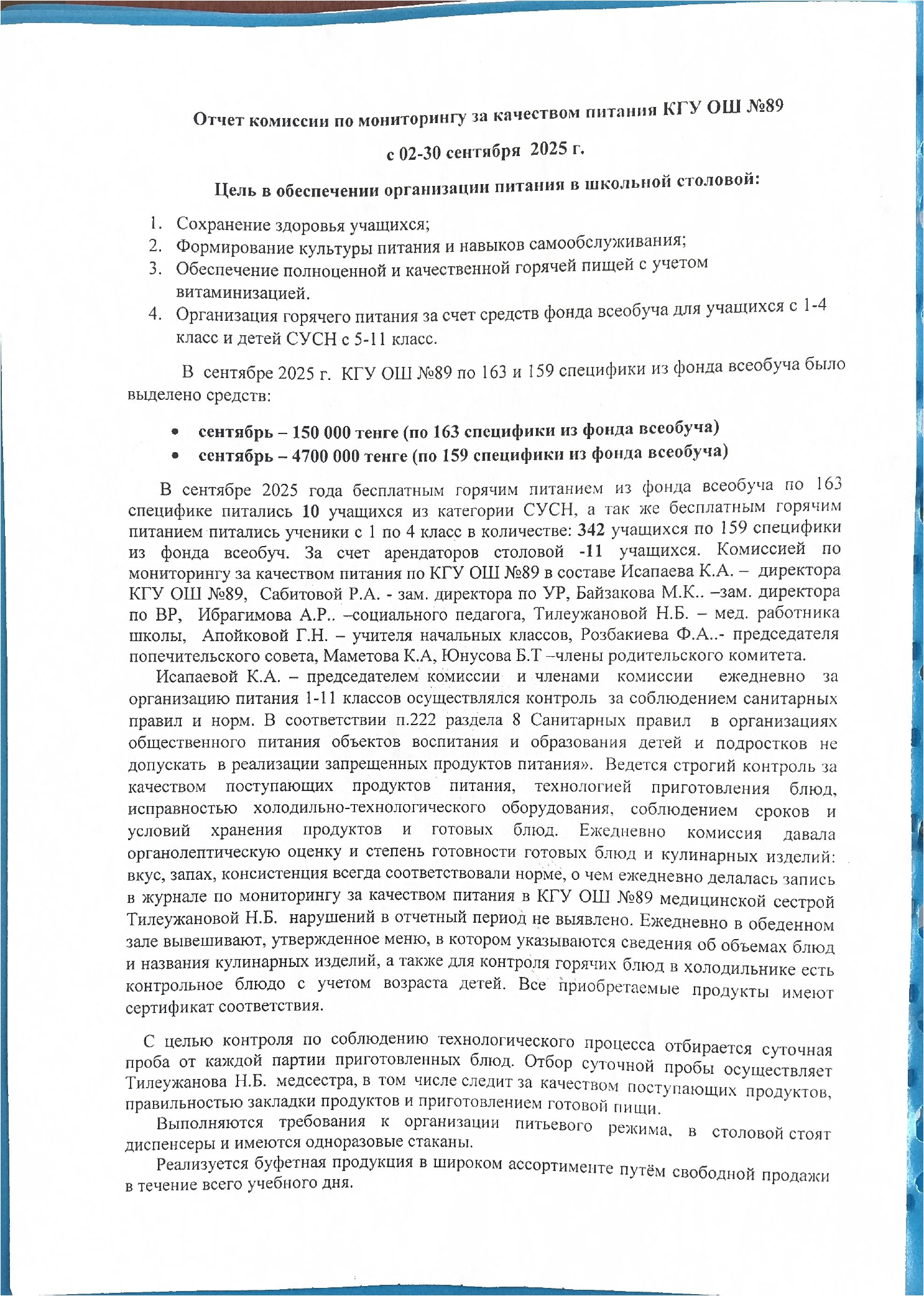 10 қыркүйек 2025 0 1 2 3 4 5 Қыркүйек айындағы тамақтану сапасын бақылау есебі / Отчет по мониторингу за качеством питания за сентябрь