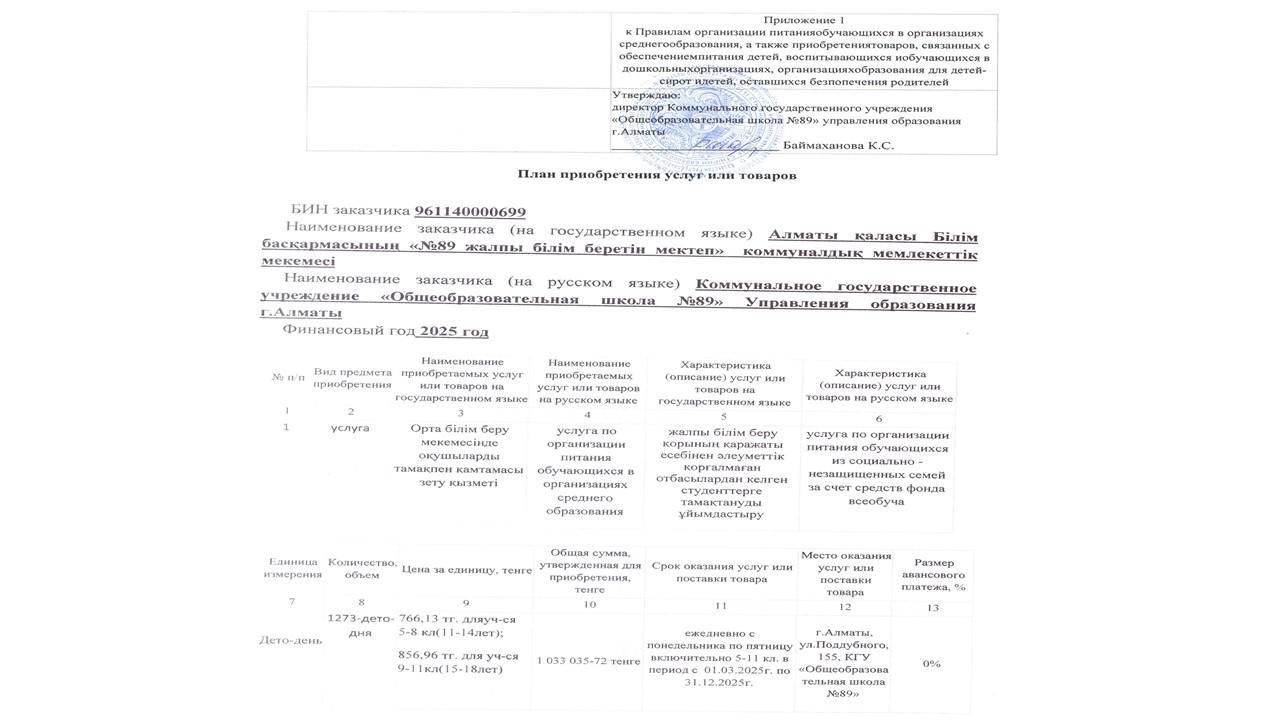 » » » План приобретения услуг на 2025 по организации питания учащихся из малообеспеченных семей 163 спец. (Всеобуч).Аз қамтылған отбасылардан шыққан оқушыларды тамақтандыруды ұйымдастыру бойынша 2025 ж. арналған қызметтерді сатып алу жоспары 163 арнайы.