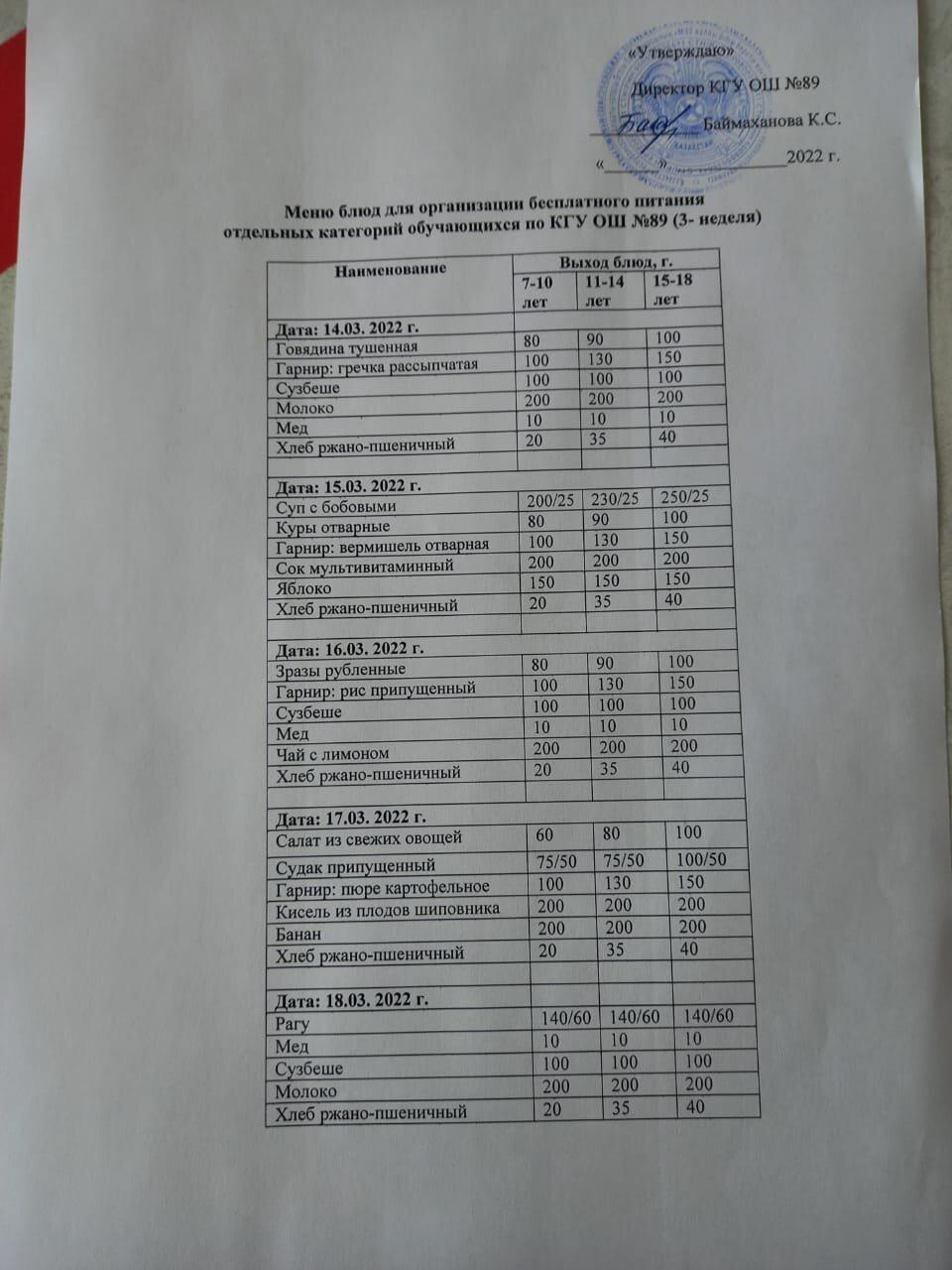 Тегін тамақтануды ұйымдастыруға арналған тағамдар мәзірі 2-апта / Меню блюд для организации бесплатного питания 2-неделя
