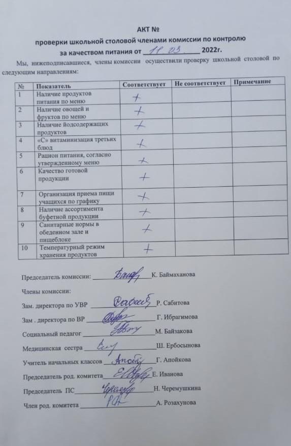 Тамақтану сапасын бақылау жөніндегі комиссия мүшелерінің мектеп асханасын тексеру актісі / Акт проверки школьной столовой членами комиссии по контролю за качеством питания